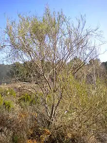 Very branched shrub that can reach up to 3 m. The stems have 8 to 10 slightly hairy T-shaped ribs. Leaves alternate entire, with a single lanceolate leaflet and stipulate. Flowers in clusters of up to 30 yellow florets. Flowers from May to July. Pod-shaped fruit with up to 6 seeds.
