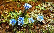 Gentiana sino-ornata, the showy Chinese gentian, is a species of flowering plant in the family Gentianaceae, native to western China and Tibet. It is a low-growing semi-evergreen perennial growing to 5–7 cm (2–3 in) tall, with multiple prostrate stems 15–30 cm (6–12 in) long, bearing single trumpet-shaped flowers of a pure blue with a white- and green-striped throat, in autumn.[3]