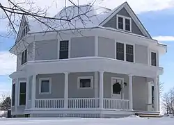 George H. Gallup was committed to the octagon house, having built three of them.[2] The first was built in 1893 on North Elm Street in Jefferson. It featured Queen Anne detailing, and it was somewhat asymmetrical because of its porch and bay placement. He sold this house in 1899 and began building a second one. Gallup began building his third and final octagon house in 1901 and completed it the following year. It was in this house that his son George was born and raised. The 21⁄2-story frame house is built on a rubble coursed stone foundation. Its eight sides are 16 feet (4.9 m) wide and covered with clapboard siding.[2] The house is capped with a truncated octagonal roof.