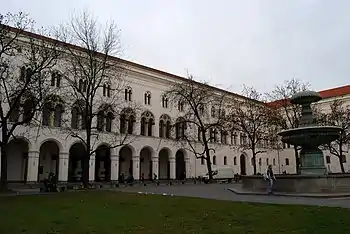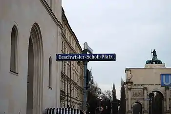 48°09′02.68″N 11°34′50.25″E / 48.1507444°N 11.5806250°E Geschwister-Scholl-Platz (Scholl Siblings Plaza) is a short semi-circular plaza located in front of the main building of the Ludwig Maximilian University of Munich (Ludwig-Maximilians-Universität München), located on the Ludwigstraße in Munich, Germany.[1] The plaza is named in memory of Sophie Scholl and her brother, Hans Scholl, students at Ludwig Maximilian University of Munich during World War II who were among the founding members of the White Rose (Weiße Rose) resistance movement. They were the Geschwister Scholl (Scholl Siblings).[2]
