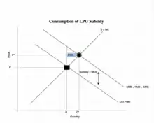One of the public-sector solutions to externalities is by implementing subsidies, or making a payment, that lowers the cost of consumption or production respectively. Therefore, a subsidy is a marginal external benefit that can either lower the social cost or increase the social benefit.[15] In the case of LPG consumption, the government lowers the cost of consumption through subsidies, thus allowing more people to be able to access the cleaner fuel. This results in an increase in the quantity consumed, therefore letting it reach its socially optimal amount.[15]