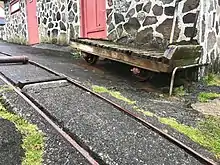 The incline railway operates a narrow-gauge line from the low-level harbour inside the gorge, up a steep incline to the boathouses of the upper village. The line terminates just in front of the village coffee house (Gjáarkaffi). There are no locomotives, and motive power is provided by a winch operating a rope which is attached to the goods wagons. Although the railway is designed for freight transportation, it is a common sight to see local people riding on the wagons with the freight. The winch house is located at the top of the incline, overlooking the gorge. The rope passes from the winch house to the pivot through an underground channel, the route of which may be observed as a series of metal plates set into the road surface. From the pivot onwards the rope is attached to the wagons, and on the incline section of the line it passes over rollers set centrally between the rails of the permanent way.