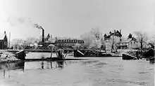 About this same time, the Melrose Knitting Company was set up as a subsidiary. It produced about 45,000 dozen pairs of men's wool socks and lumberman's socks a year. Sixty to seventy people worked there, and a hundred could have been employed if they could be found. Because of the shortage of labour, twelve English automatic machines were installed; and with the care of two boys, they knit 60 dozen pairs of socks a day. The mill was run by water power, though a 100-horsepower boiler and engine used for heating and drying could provide emergency power; and their own dynamo produced the electricity to run delicate machinery and lighting." After Barraclough's death, the mill passed through a number of operators, and was destroyed by fire in 1954.[3]