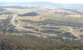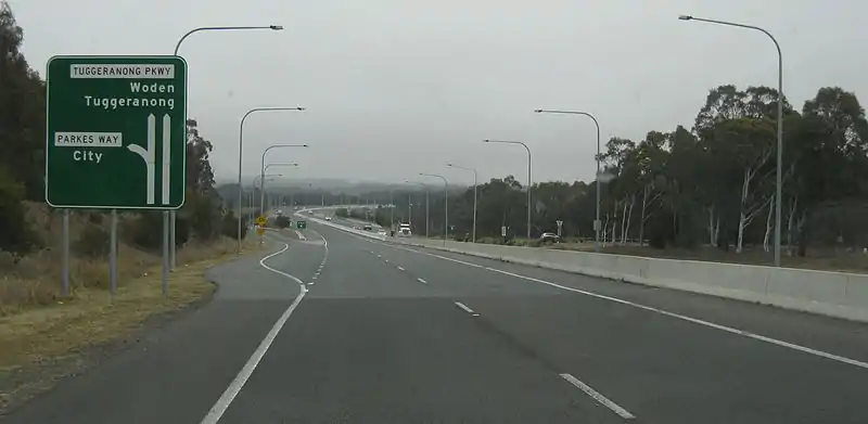 Glenloch Interchange is Canberra's only major interchange which connects Tuggeranong Parkway with Parkes Way, William Hovell Drive and Caswell Drive (Gungahlin Drive Extension).[1][2] Following a major reconstruction lasting from 2007 to mid-2008, the interchange now operates without traffic lights. A surprising feature was the retention of an unused bridge from the previous alignment which led from the centre of the Parkes Way/Caswell Drive loop, passing east over two northbound roads, before petering out to the east. This was finally removed in late 2010 during roadworks to upgrade the new interchange to dual carriageway standards.