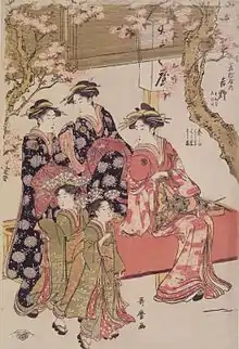 Courtesans Strolling Beneath Cherry Trees Before the Daikokuya Teahouse, probably 1789. Oban tate-e triptych, woodblock print, color on paper. Three courtesans and their kamuro (child attendants) and shinzo (apprentices) at the Daikokuya Teahouse. In the right-hand sheet, a tanzaku sheet hangs from the branches of the cherry tree with a poem by Yadoya Meshimori (1753-1830), later known as Rokujuen. Brooklyn Museum