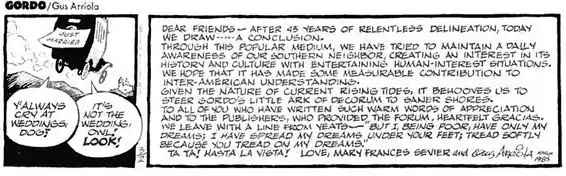 The final strip ran on March 2, 1985, where, in a final effort to avoid the advances of the widow Artemisa Rosalinda Gonzalez, Gordo marries his longtime housekeeper, Tehuana Mama. Arriola used three-quarters of the strip to say farewell to his readers.