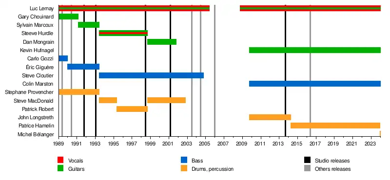 In fact, the writing for the following album had been completed by the end of 1993, but due to a lack of label interest the release of the album was severely delayed.[6] Lemay, the only remaining original member, returned in 1998 on Olympic Recordings with a new line-up consisting of Steeve Hurdle (guitar), Steve Cloutier (bass guitar) and Patrick Robert (drums).[5] Under this lineup they released their third full-length album, Obscura, which has come to be regarded as "one of the most pungently progressive albums ever made, in or out of metal."[7]