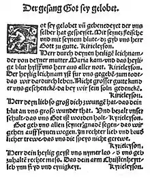 The hymn is in three stanzas of eight lines each, with "Kyrieleis" repeated every four lines.