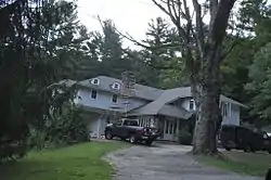 The Gould House stands in a rural residential area southwest of Norfolk's village center, on the east side of Golf Drive just north of the Norfolk Country Club. It is a two-story wood-frame structure, set on a sloping lot. The house's most distinguishing feature is its unusual roof configuration. It is basically a broad gabled roof, which extends down to the first floor on the left side, and then wraps across the front between the first and second levels. Above this is a hip-roofed projection, giving that portion the appearance of a gable-on-hip configuration. A projecting hip-roofed section projects to the left further back, giving the overall house massing an L shape. The ground floor is finished in broad clapboards, while the upper levels are shingled. Fieldstone posts provide some visual differentiation on the first floor.[2]