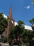 The church building was designed by architect Richard Upjohn and built in 1845–46, when the area had a much more residential character. It is a relatively simple expression of Gothic Revival architecture, and is notable as the first building in which Upjohn used asymmetry in a church's massing.[3] In 1912, Cram, Goodhue & Ferguson added a parish house[4] which connects with the church through several narrow, twisting stairwells and passages.[5] The parish house was remodeled and enlarged in 1950 by Harkness & Geddes.[4]