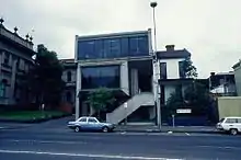 Located at 52 Victoria Street Melbourne, the Plumbers & Gasfitters Union building is known as the most persisting and noticeable landmark of Brutalism. The building was completed in 1970 by Graeme Gunn and his creative collaboration with Merchant Builders and landscape architect Ellis Stones.[2] The design itself was architecturally intended to be up to date.[3] The facade is formed of concrete in bold expressionistic forms with dark smoked glazing that intensify the sculptural quality of the construction.[4] Structurally designed to receive an extra floor when needed, the building consists of a car parking and mechanical services area, one main office floor housing the clients, conference room and lobby, and one office of lettable space.[5] For the internal finishes, walls, concrete block work, and stud frame sheeted with plywood are painted. The addition of signage on the building is slightly unsympathetic to the building's initial character.