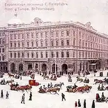 In the 1910s, the hotel was remodeled in the Art Nouveau style to designs by Fyodor Lidval and Leon Benois. During the Soviet period, the hotel was known as the Hotel Evropeiskaya. It was completely restored between 1989 and 1991[1] and reopened in December 1991, managed by the Swedish Reso Hotels chain as the Reso Grand Hotel Europe.[2]