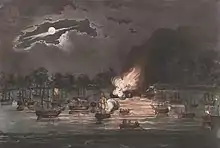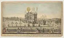 The event was centred on London's Royal Parks, which were lit with lanterns during the night.[3] The Prince Regent's personal architect John Nash was commissioned to design a Chinese-style bridge and pagoda across the canal in St James's Park.[1][3] A "Temple of Discorde" was erected in Green Park which, by means of a mechanism designed by Sir William Congreve and under cover of firework display, transformed into a "Temple of Concorde". During the fireworks display aeronaut Windham William Sadler ascended in a hot air balloon and distributed favours and programmes onto the crowd below.[4] Also a sign reading "PEACE" was illuminated.[3] During the jubilee night Nash's pagoda set alight and at least one man, James Taylor,[2][5] was killed.[6]
