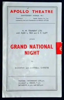 Grand National Night is a 1945 thriller play by the British writers Campbell Christie and Dorothy Christie. A racehorse owner quarrels and accidentally kills his wife on the evening of the Grand National.