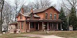 The Granger House, also known as the Marion Historical Museum and the Granger House Museum, is a historic building located in Marion, Iowa, United States. This Victorian Italianate house was built around 1860 by Charles Myers. Earl Granger bought the house in 1876 and it remained in his family until 1973.[2] Granger built the carriage house in 1879, and built an addition onto the main house the following year. The two-story brick building features a 1+1⁄2-story ell, a gable roof, bracketed eaves, and arched stone lintels over the symmetrically arranged windows. The front porch is not the original. The house was listed on the National Register of Historic Places in 1976.[1]