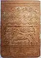There were a number of grave stelai or stelae found among the six shaft graves at Grave Circle A in the site of Mycenae. These stelai mark the burial sites of the Mycenaean dead, much like modern headstones. At least 21 stelai have been discovered from Grave Circle A, with 12 having identifiable relief sculpture. Most were upright, rectangular slabs of oolithic limestone, ranging in date from 1600 to 1500 BCE.[1] The iconography depicted on these stelai include chariot scenes, hunting scenes, and circular and spiral designs characteristic of the Greek Mycenaean Period.[2] Scholars argue that these scenes demonstrate the prevalence of warfare in Mycenaean culture,[2] in addition to signifying a socially stratified society.[3]