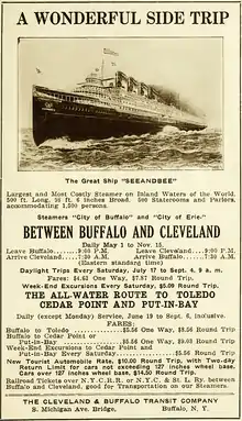 Steamboat lines were established by railroads on the Great lakes to join railheads in the 1850s. This service carried goods and passengers from railroads in the East across the length of the lakes to railroads for the journey West. Railroads bought and built steamship lines to complement railroad services. One such railroad-owned steamship line was formed by the Pennsylvania Railroad in 1865 to connect their terminals at Buffalo to those of the Northern Pacific Railroad at Duluth, Minnesota. This new line, owned by the Erie and Western Transportation Co., became the well-known Anchor Line. The Northern Pacific started its own Northern Steamship Company which, from the mid-1890s, operated the steamers, North Land and North West on 7-day round trip cruises between Buffalo to Duluth.[5] Travelers could disembark at several points and were allowed to finish their voyage later in the season.