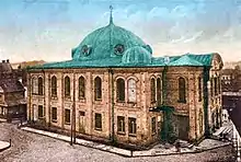 The Great Synagogue (Polish: Wielka Synagoga w Białymstoku) was a synagogue located in Białystok, Poland, which was built between 1909-1913 and designed by Szlojme Rabinowicz. The synagogue was burnt down by Germans on June 27, 1941, with an estimated number of 2,000 Jews inside.