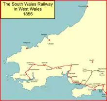 The line between Carmarthen and Neyland was doubled on 1 July 1857.[13] There was now a double track broad gauge line throughout from Paddington, 285+14 miles in length, of which 164 miles belonged to the South Wales Railway.