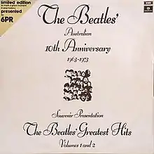 In 1973, both volumes of the album were repackaged as a double album by EMI Australia to commemorate the 10th anniversary of the Beatles first single in Australia. The release was titled The Beatles Australian 10th Anniversary 1963-1973 Souvenir Presentation - The Beatles' Greatest Hits Volumes 1 and 2.[3] Eight different Australian radio stations promoted the album by featuring their logo on eight different stickers. The album was only available for a few months before it was quietly deleted.[3]