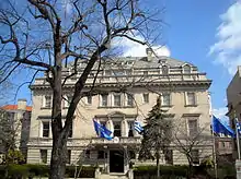 A 12-foot bronze statue of Harry Truman was erected in Athens in 1963, with the help from Greek-Americans. It is one of only eight statues of American presidents outside the United States. The statue has been a focal point of anti-Americanism in Greece. It has been toppled over several times, painted and vandalized.[30] In March 1986, it was destroyed by a dynamite bombing by a group considering it as being a symbol of American imperialism. The statue was restored within a year by the government[31] although it had originally been refused by the Athens City Council.[32][33] More recently in April 2018, a group of students tried to topple the statue during a communist anti-American protest but were stopped by riot police.[34]