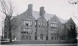 The institution that would become East High School began in 1856 with the construction of Green Bay's Sale School (nicknamed "Old Brick") on land donated to the city by fur trader John Jacob Astor. Sale was the first school built by the Green Bay Area Public School District. The school traces its formal beginnings (celebrating a sesquicentennial in 2011) to a Professor Furber, who added Latin and mathematics to the grade school curriculum in 1860.[2] The first class to receive diplomas, consisting of four men and two women, was the class of 1875.[2] The school moved to a new location on South Webster Avenue in 1893 and its students became known as the Hilltoppers. After the move, "Old Brick" continued to be used by the school district for administrative purposes, and was torn down in 1957.[3] While at the Hilltopper building, the school published a literary magazine called Aeroplane beginning in 1910. The publication's commencement edition served as a pseudo-yearbook, and began printing directories of the whole school in its 1917 edition.[4] The publication was renamed East High Aeroplane in 1924 in anticipation of the school's move to its new location.[5]