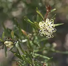 Grevillea viridiflava, commonly known as linear-leaf grevillea,[2] is species of flowering plant in the family Proteaceae and is endemic to eastern Australia. It is an erect, spindly shrub with linear to narrowly elliptic leaves, and clusters of 12 to 24 white flowers with a yellowish-green or cream-coloured style.