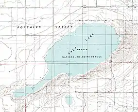 The central focal point of the Grulla National Wildlife Refuge is an ephemeral salt lake or saline playa – a shallow basin that collects runoff from the surrounding drainage area during heavy downpours but then often dries completely due to evaporation. This playa lake has been known by various names. Current USGS topographic maps and most commercially available maps of this region refer to this saline playa simply as "Salt Lake".[2][3] Back in the early 1880s, this playa was part of the DZ Ranch, and those familiar with the ranch often favor the name "DZ Lake". The lake is also frequently called "Arch Lake" after the nearby community of Arch, New Mexico, located around 6 km to the northwest.[4][5]