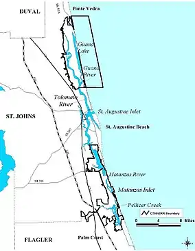 In 2004 the Guana River State Park was acquired by the Guana Tolomato Matanzas National Estuarine Research Reserve and is now included in the reserve. It is no longer a State Park.[5] The research reserve is located along State Highway A1A, between St. Augustine and Jacksonville. Bounded by the Atlantic Ocean and the Intracoastal Waterway (Tolomato River), the Guana Tract, which includes the Guana Tolomato Matanzas National Estuarine Research Reserve (GTM Research Reserve) and Guana River Wildlife Management Area, comprises some 12,000 acres (49 km2) of public conservation and recreational uplands.