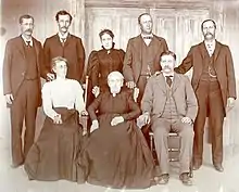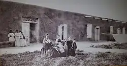 Gutiérrez-Hubbell family in 1867. Julianita Gutiérrez fifth from right, James Santiago Hubbell, second from right.