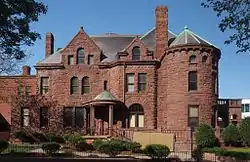 William Channing Whitney designed the H. Alden Smith house in the Richardsonian Romanesque style of architecture. Featuring a brown sandstone facade, the three-story home boasts a massive corner tower, front and side porches, and a stained-glass skylight.[4] Although much of the interior has been modified over time, the first level retains the original reception hall and grand staircase. The original parlor, dining room, library, and sitting room also remain intact. Decadent panelling and cherry woodwork can be found throughout this level.