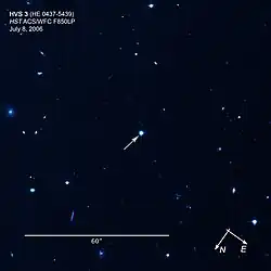 HE 0437-5439 is a massive, unbound hypervelocity star (HVS), also called HVS3.[2] It is a main sequence B-type star located in the Dorado constellation. It was discovered in 2005 with the Kueyen 8.2-metre (320 in) telescope, which is part of the European Southern Observatory's Very Large Telescope array. HE 0437-5439 is a young star, with an age of around 30 million years.[3] The mass of the star is almost nine times greater than the mass of the Sun[4] and the star is located 200,000 light years away in the direction of the Dorado constellation, 16 degrees northwest of the Large Magellanic Cloud (LMC) and farther away than the LMC.[3] The star appears to be receding at an extremely high velocity of 723 kilometres per second (449 mi/s), or 2,600,000 kilometres per hour (1,600,000 mph). At this speed, the star is no longer gravitationally bound and will leave the Milky Way galaxy system and escape into intergalactic space. It was thought to have originated in the LMC and been ejected from it soon after birth. This could happen if it originally was one of a pair of stars and if there is a supermassive black hole in the LMC.[4]