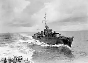 A month later, the destroyer was assigned to convoy escort duties along the Australian coast, and again began escorting convoys to New Guinea in early August.[5] In this role she first saw action when she attacked and sank the Japanese Kaichū type submarine Ro-33 off Port Moresby on 24 August 1942, killing all 42 men aboard.[9]