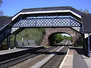 The station retains one of its Great Western Railway era station buildings and its canopied footbridge, both dating from 1884. Although typical of its era, very few examples of that kind of ornamental ironwork bridge now survive and it was listed grade 2 in 2000.[2] When it was refurbished in late 2011, the colours reverted from its former navy blue and white to the original GWR cream and salmon livery.[3] The footbridge was also used by Hornby as the basis for its 00 Gauge model.[4]