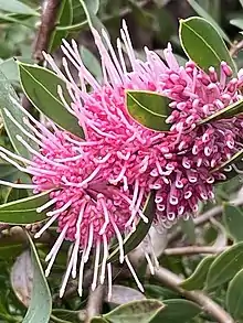 Hakea 'Burrendong Beauty' is a small, spreading shrub to 1.5 m (4 ft 11 in) high and 2–3 m (6 ft 7 in – 9 ft 10 in) wide. It has rigid, elliptic shaped leaves 40 mm (1.6 in) long. It has deep pink, globular shaped flower, cream styles that appear in clusters in the leaf axils during winter. The hybrid plant rarely sets seed.[1]