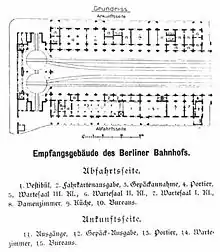 The former Bergedorfer Bahnhof was extended for the needs of the Berlin-Hamburg railway using red brick with plastered cornices and provided with a 148-meter-long and 23.5 m-high wooden train shed with four tracks. This train shed was considered at the time to be the most substantial wooden structure in Germany. The station building was divided into departure and arrival areas with a baggage check-in and check-out and waiting rooms of different classes. It also had a ladies room.