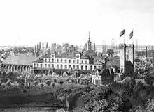 The commissioning took place on 15 December 1846, but the renovation and construction of the 173 m-long building complex, the freight tracks and the roundhouse were not completed until 1857. The station had two high towers for an optical telegraph connection, but since an effective electrical telegraph had already been invented, they were purely decorative. The entrance building also had two turntables for locomotives. These were detached from the train and turned on the turntables so that they could pull the train in the opposite direction. The station precincts, which included a freight yard and a semi-circular engine shed, were about three times as long as the station.