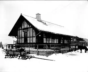 The station depot was replaced by a wooden one-story depot, referred to by locals as a shack, along the side of the tracks in downtown Turner.[3] The new station itself lasted around the same amount of time that its predecessor station depot had; however, the widow of Edward Henry Harriman (d. September 9, 1909[14]), a local railroad executive whose Arden estate was in the nearby hills, donated land in February 1910 in a different portion of Turner to build a brand new station to the east.[15] The old one-story depot had a roof and structural supports that were aging and on the verge of collapsing to the ground.[16]