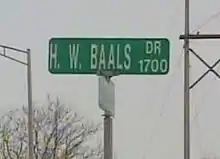 Harry Baals Drive was named in honor of the late mayor, extending east from Parnell Avenue, north and west of the St. Joseph River in Johnny Appleseed Park. In recent years, the double entendre arising from Baals's name has led Fort Wayne officials to shy away from naming streets and buildings after him. The aforementioned street has been renamed "H. W. Baals Drive" due to persistent theft of the street sign.[8][9]