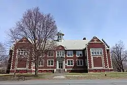 Hatfield's town center is basically linear, running north-south on Main Street, which is separated from the Connecticut River by agricultural fields. The district abuts the Elm Street and the Mill-Prospect Street Historic Districts to the west. Main Street is characterized by well-spaced residential lots containing homes built in the 18th and 19th centuries, and the civic heart of the town, where the town hall, Center School, and Memorial Hall are located.[2] The lot arrangement, with houses built close to the street, was in part a deliberately defensive plan, which was in the colonial period surrounded by a fortified palisade against attacks from Native Americans. Although most of the buildings are now of later construction, the plan is still evident.[3]