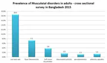 - ↑ Zahid-Al-Quadir, Ahmad; Zaman, M. Mostafa; Ahmed, Shamim; Bhuiyan, Mahfuzur Rahman; Rahman, Md Mujibur; Patwary, Ismail; Das, Bidhu Bhushan; Hossain, Shaikh Amir; Paul, Sujat; Shahin, Abu; Rahman, Moshiur; Haq, Syed Atiqul (December 2020). "Prevalence of musculoskeletal conditions and related disabilities in Bangladeshi adults: a cross-sectional national survey". BMC Rheumatology. 4 (1): 69. doi:10.1186/s41927-020-00169-w. PMC 7739446. PMID 33323124.
