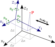 If the transformation parameters are unknown, they can be calculated with reference points (that is, points whose coordinates are known before and after the transformation. Since a total of seven parameters (three translations, one scale, three rotations) have to be determined, at least two points and one coordinate of a third point (for example, the Z-coordinate) must be known. This gives a system with seven equations and seven unknowns, which can be solved.