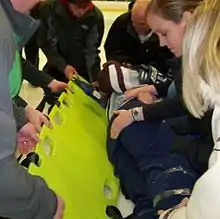 - ↑ Laprade RF, Schnetzler KA, Broxterman RJ, Wentorf F, Gilbert TJ (Nov–Dec 2000). "Cervical spine alignment in the immobilized ice hockey player. A computed tomographic analysis of the effects of helmet removal". Am J Sports Med. 28 (6): 800–3. doi:10.1177/03635465000280060601. PMID 11101101. S2CID 5901650.