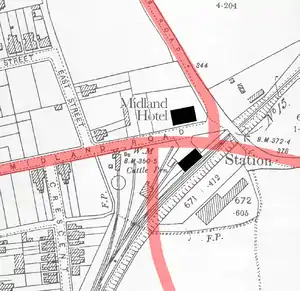 1898 OS map showing the location of Hemel Hempsted station (modern road layout is overlaid in red with station and the Midland Hotel marked)