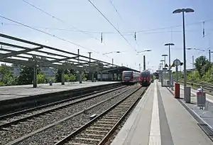 Hennigsdorf is a railway station in the Oberhavel district of Brandenburg, located in the town of Hennigsdorf. It is the northern terminus of the S-Bahn line S25 as well as a station for regional passenger trains and freight services.