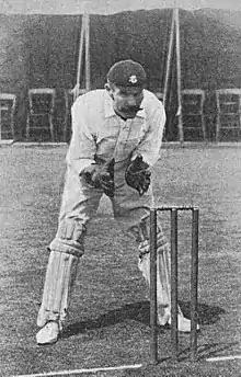 Towards the later stages of his career he suffered from failing eyesight, and repeated fractures to his fingers.[6] He averaged 30.26 with the bat in 1895 including four half-centuries, and grew more prolific with the gloves: passing fifty catches in a season in both 1896 and 1897. He batting average otherwise remained in the mid-teens, however, and he played only nine matches in 1900 before his professional playing career ended.[5][10] He became a full-time umpire in 1910, having umpired sporadically as early as 1891, and in total he stood in 94 first-class matches.[16] He died in Waddon, Surrey in 1919.[1]
