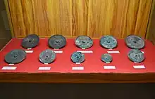 The tumulus has two burial chambers, one in the posterior and one in the anterior portion, both parallel to the main axis of the burial mound. Since the posterior portion was broken into and partially destroyed by grave robbers, an emergency archaeological excavation was conducted by the Inuyama City Board of Education in 1973. A vertical-type stone chamber with a gravel floor was found, with the surfaces of the walls and ceiling covered in clay and painted in vermillion. Many grave goods were recovered, including eleven ancient bronze mirrors, magatama and cylindrical beads, jade balls, wheel-shaped stones, iron implements (including swords, daggers, spears and agricultural implements) and a cracked bamboo-shaped sarcophagus. From these grave goods, it was estimated that the kofun dates from the late 3rd to early 4th century, making it one of the earliest in Owari Province. All of the excavated items were designated as Important Cultural Properties of Japan in 1978[3] and are now stored at the Kyoto National Museum.[2]
