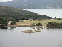 The High Island Detention Centre (Chinese: 萬宜羈留中心) was a refugee camp in Hong Kong built near the West Dam of High Island Reservoir for hosting refugees and boat people from Vietnam. The area is now a flat piece of grassland that is grazed by cows. It has a pavilion that leads out of the strip of land.