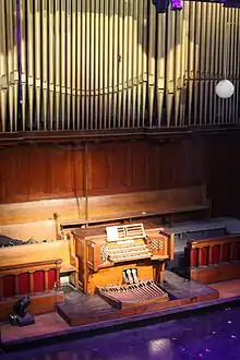 The 2,045 pipe, three-manual pipe organ made by the famous Casavant Frères in Quebec is the largest such instrument on Cape Breton Island.[8] Its facade, casing, pipes, swell and chorus boxes completely fill the apse of the theatre. The organ was purchased for the new church, then under construction, in 1911 for $5,595 as Casavant Brothers, Ltd., Opus 452.[9][10] The original specification was for three manuals, 4 divisions, 29 stops, 27 registers, 29 ranks, 1843 pipes. A Stoplist for the 1911 instrument copied from the factory specifications for Casavant Op. 452 1911 3/29, courtesy of the Casavant Frères Archives, St. Hyacinthe, Québec, Canada is available by following this link: Original Stoplist