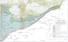 To the north and west of the Highland Boundary Fault lie hard Precambrian and Cambrian metamorphic rocks: marine deposits metamorphosed to schists, phyllites and slates, namely the Dalradian Supergroup and the Highland Border Ophiolite suite.[3] To the south and east are Old Red Sandstone conglomerates and sandstones: softer, sedimentary rocks of the Devonian and Carboniferous periods.[4] Between these areas lie the quite different rocks of the Highland Border Complex (at one time called the Highland Boundary Complex[11]), a weakly metamorphosed sedimentary sequence of sandstones, lavas, limestones, mudstones and conglomerates. These make up a zone which is found discontinuously along the line of the fault and which is up to 1.2 kilometres (3⁄4 mi) in width.[12]
